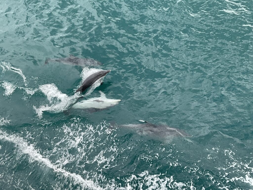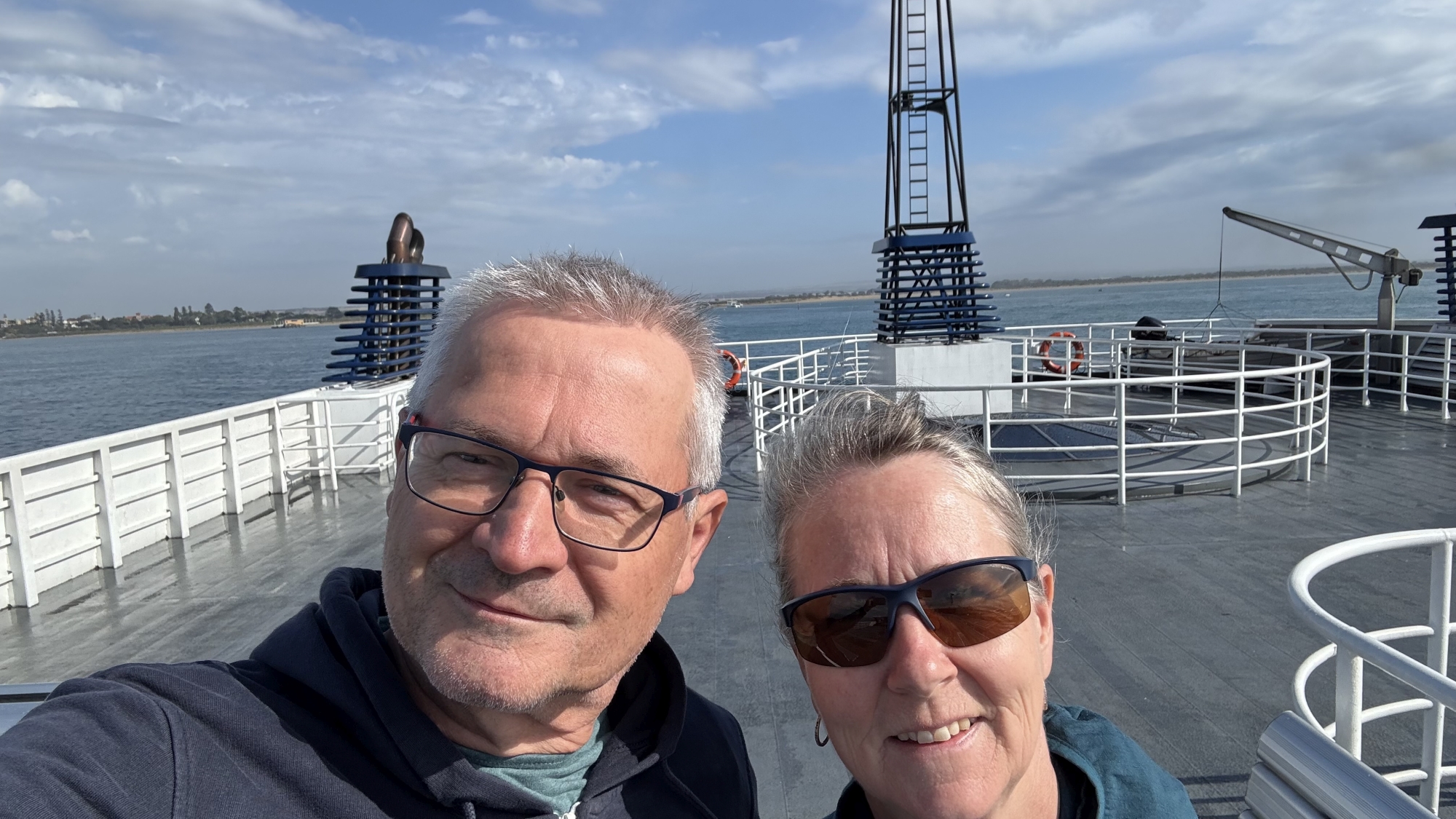 Heute sind wir wieder 'früh' losgefahren, um die Fähre um 11 Uhr zur Mornington Peninsula zu erwischen. Wir haben es dann sogar auf die nicht allzu stark ausgelastete 10 Uhr Fähre geschafft. Diese Halbinsel (Peninsula) liegt ca. 60 km südlich von Melbourne. Die Überfahrt war sehr angenehm und wurde dann auch noch zu einem eindrücklichen Erlebnis. Sybil erspähte schon von weitem Delfine und plötzlich schwammen sie gleich neben der Fähre entlang und machten eine richtige Show für all die Passagiere, die an der Reling standen. Herrlich 😃