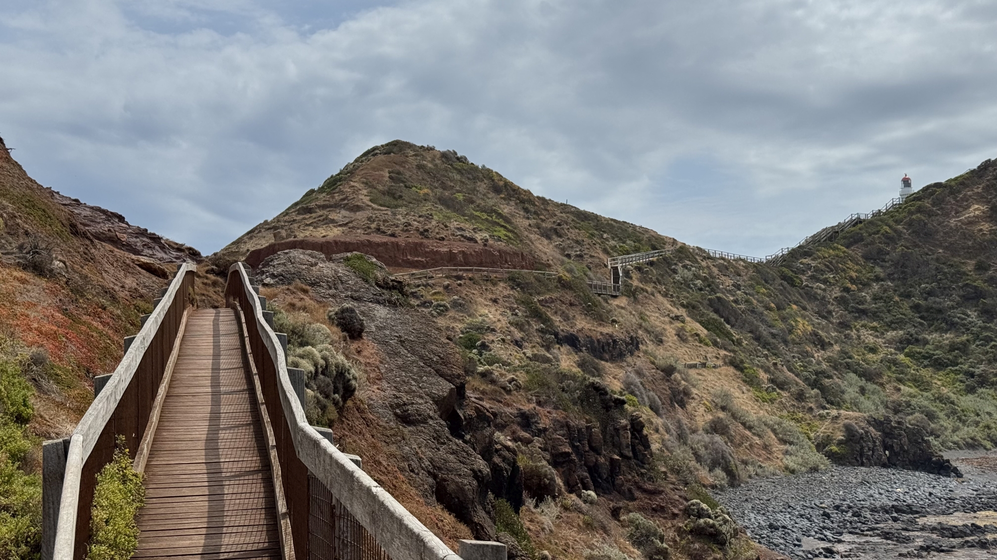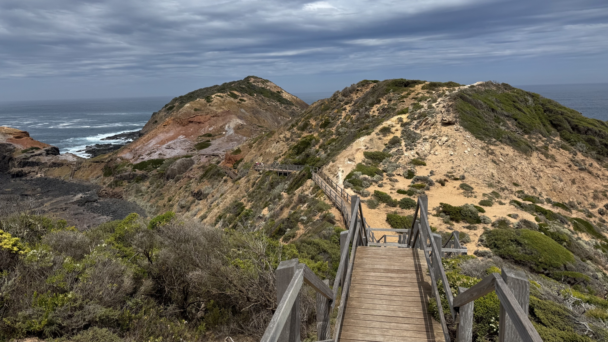 Nach einem Spaziergang mit Ausblick dort oben, fuhren wir zur Unterkunft nach Flinders. Da das Zimmer noch nicht bereit war, machten wir noch einen Ausflug zum Cape Schanck, wo wir über etliche Treppenstufen bis zum Meer hinunter gehen konnten und dies natürlich dann auch wieder hoch mussten. In Flinders selbst ist leider nicht gross was los.