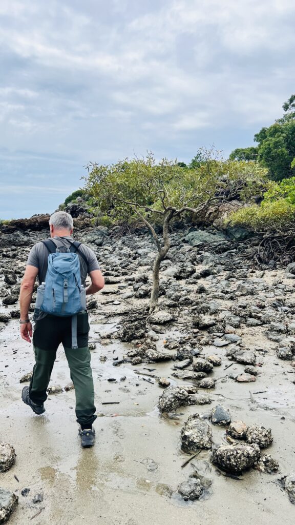 Wir spazierten erst zur Wedge Island, zu welcher man nur bei Ebbe mit trockenen Füssen kommt. Danach ging es bis auf 100 Höhenmeter durch den Wald, stellenweise über etliche Stufen. Beim Andrews Point Lookout konnte man im Meer wieder Schildkröten sehen, allerdings tauchten sie meist zu wenig auf, um schlaue Fotos zu ermöglichen und mit dem 300 mm Teleobjektiv war man auch etwas zu weit weg dafür.